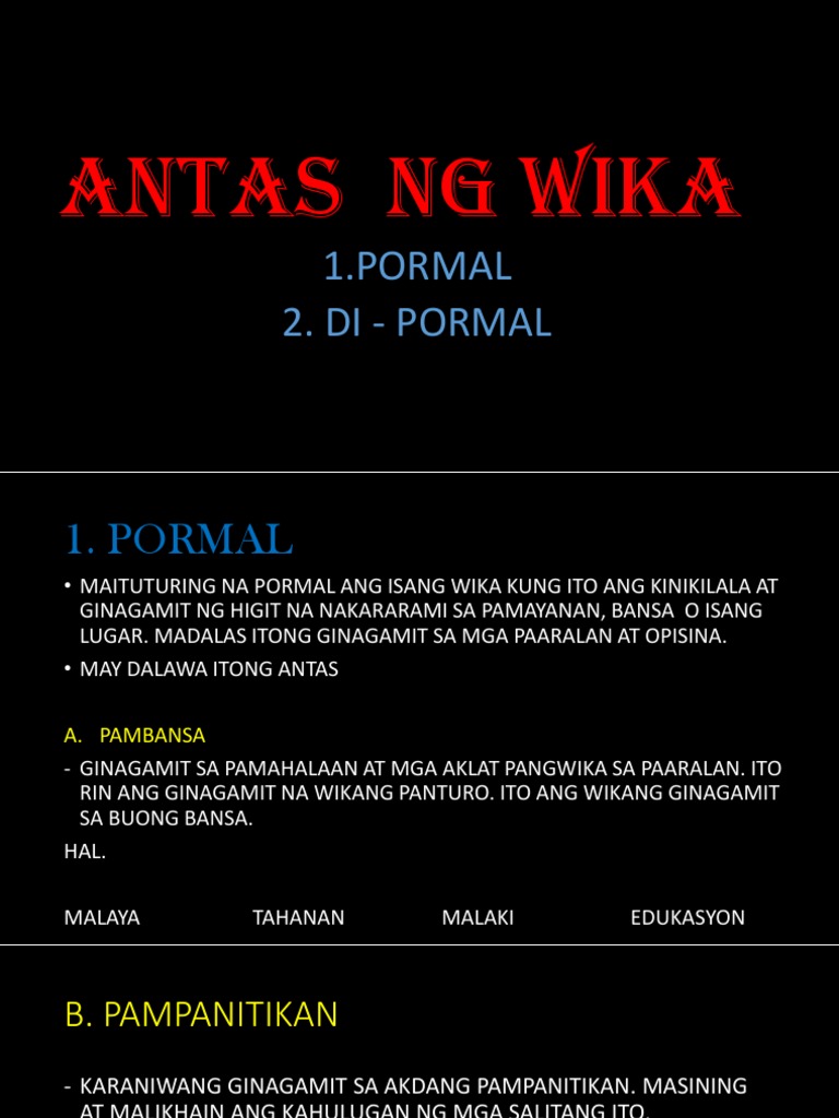 19102011 Ang halimbawa ng pormal na wika aypambansa - ginagamit sa buong bansapampanitikan - pinakamataas na antas ng wika at ginagamit ang mga matalinghagang ekspresyonAng halimbawa naman ng di-pormal ay pabalbal - ginagamit ng mga istambaykolokyal - tinanggap na ng wikang Filipino pero hindi kadalasang ginagamitlalawiganin - ginagamit sa mga. Ang form na ito ng paggamit ng wika ay kilala rin bilang colloquialism o casualism. 1592016 Ang sosyalekto ng mga Jejemon na tinatawag na Jejenese magiging literal na Jejenismo sa Wikang Tagalog ay nanggaling mula sa Ingles Filipino at ang kanilang paiba-ibang Taglish.
