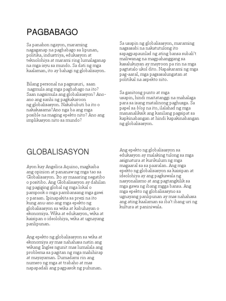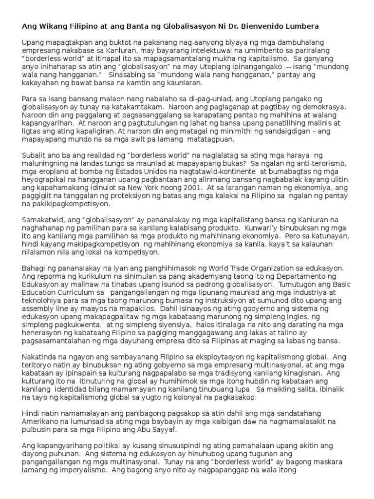 Epekto ng globalisasyon sa wikang filipino essay. Buong Pilipinas handa na nga ba sa makabagong henerasyon ng pagpapaunlad hinggil sa makabago at produktibong wikang Filipino. GLOBALISASYON SA WIKANG FILIPINO BILANG HAMON SA PAGKATUTO NG MGA MAG-AARAL S. Mas malayang pagdaloy ng puhunan lakas paggawa kalakal atbp.