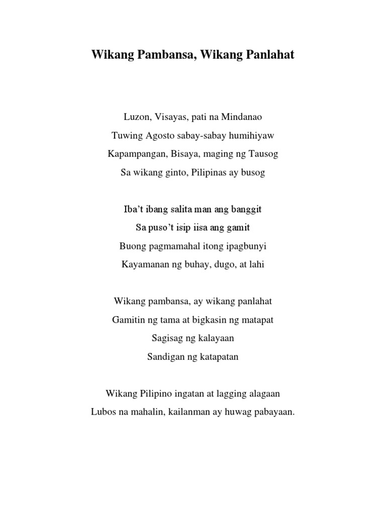 Kalaunan ay ginawang Filipino ang wikang pambansa. Mataas na pagpupugay at paggalang sa mga lumikha ng Batas Pambansa Blg. Wikang Filipino ginto mo at hiyas Panlahat na wika saan man bumagtas Ilaw na maalab sa dilim ay lunas At lakas patungo sa tuwid na landas.
