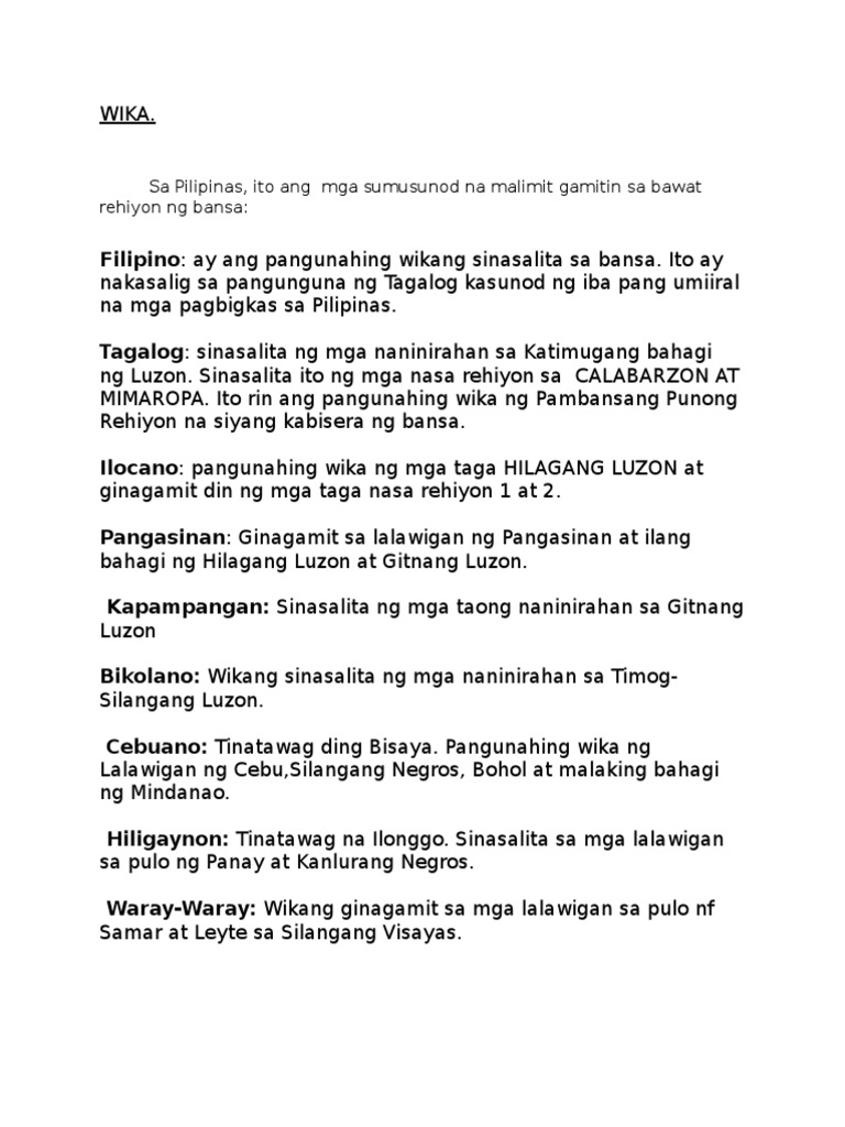 2582017 Malimit ding tawagin ang mga ito na wikang rehiyonal. Ang wika ay isang bahagi ng pakikipagtalastasan sa paghahatid at pagtanggap ng mensahe. Tradisyonal na tinatawag na walong pangunahing wika ng bansa ang Bikol Ilokano Hiligaynon Pampanggo Pangasinan Sebwano Tagalog at Waray Samar-Leyte.