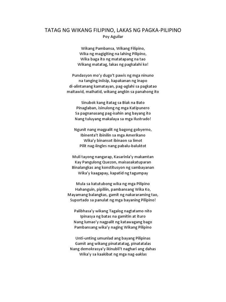 Awit tungkol sa wikang pambansa. Iniibig Ko Ang Wikang Filipino. 06082016 Sa pamamagitan ng Kautusang Tagapaganap Blg. Mga Batas Tungkol sa Wikang Pambansa.