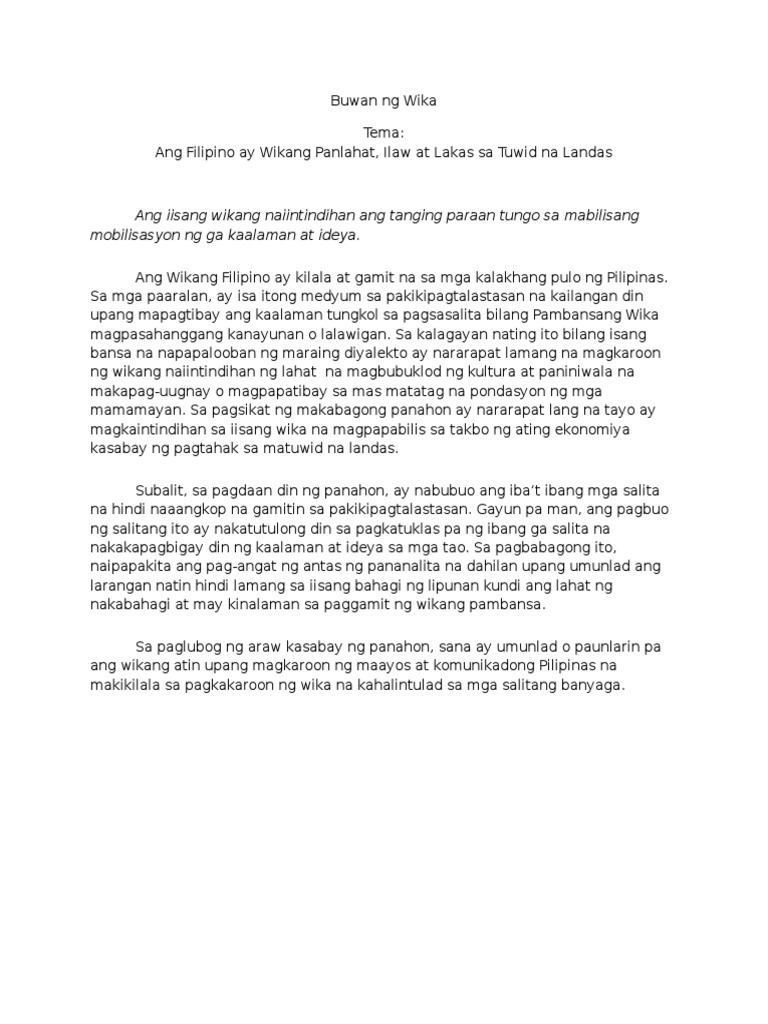Sanaysay tungkol sa wikang filipino Maikling sanaysay tungkol sa wikang filipino bilang wikang pambansa Please be aware that we am not responsible for the privacy practices of these other sites. Ng Wikang Pambansa wikang Pilipino. Sanaysay tungkol sa wikang mapagbago galing sa liryko ang wikang filipino ay isa sa mga kayamanang ating natanggap mula pa sa ating mga ninuno.