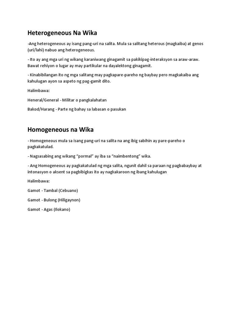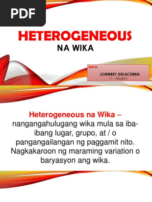 Ibig sabihin ng wikang heterogeneous. Dahil sa pagkakaiba ng mga indibidwal at grupo ng tao ayon sa lipunan na kanyang ginagalawan antas ng pamumuhay edad lebel ng edukasyon na natamasa at interes sa buhay nagkaroon ng ibat-ibang barayti ang ating wika. Ano ang ibig sabihin ng homogenous na wika. Mayroon itong tinatawag na dalawang dimensyon ito ay ang sosyal at heograpikal Ang dimensyong heograpiko ay isang dayalek na tinatawag na wikain ng ibang aklat.