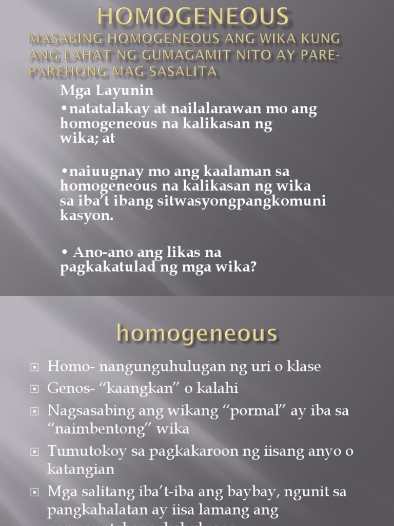 Na ang ibig sabihin ay uri o yari. Ang literal na ibig sabihin ng salitang homogeneous ay isang pang-uri na ang ibig sabihin ay pare-pareho o pagkakatulad. 07122016 Ito ay ipinaliliwanag ng teoryang sosyolinggwistik bilang batayan ng heterogenous na wika.