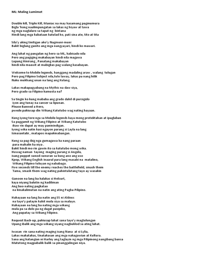 Spoken poetry po about sa wikang katutubo tungop sa wikang filipino. Pumalag tayo sa sistemang lumalamon Ilaban ang sariling atin ano mang lagay o hamon. Ang wikang Filipino ay ilaw ng Pilipinas Liwanag sa pagtahak sa tuwid na landas Gamitin natin at gawing lakas.