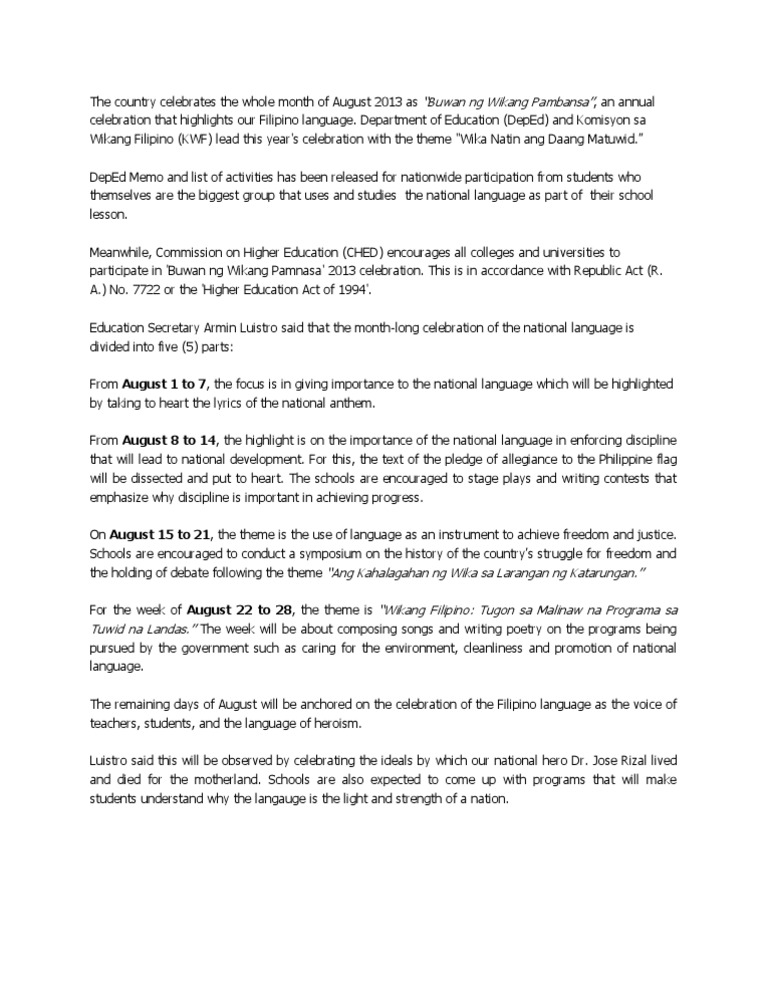 Ang Komisyon sa Wikang Filipino KWF ay mangunguna sa pagdiriwang ng Buwan ng Wikang Pambansa 2019 mula ika-1 hanggang ika-31 ng Agosto alinsunod sa itinakdang Pampanguluhang Proklamasyon Big. Ngayong pasko magdiriwang ang mundo. 09082013 For the week of August 22 to 28 the theme is Wikang Filipino.
