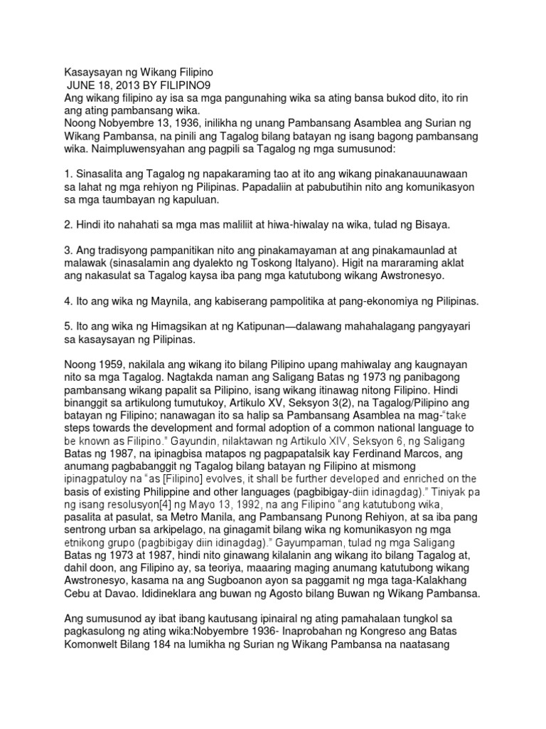 21082012 Hindi puro o solido ang wikang Filipino dahil sa maraming taon din tayong nasa ilalim ng mga dahuyang mananakop ay nagkaroon na ng ebolusyon ang wikang ito. 22072019 Para sa atin ang wikang Filipino ay ang ginagamit natin para makausap ang katulad nating Pilipino. Kailangan pahalagahan ang mga wikang katutubo at pagyamanin ang wikang Filipino dahil ang mga ito ay may kapangyarihan na ikwento ang ating kasaysayan at yaman ng ating lahi.