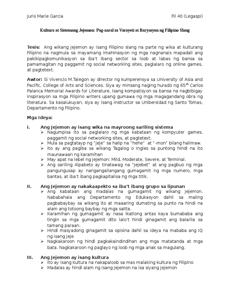 Salamat Sir Joel We are all jejemons GMANewsTV GMANewsTV - Monday June 7 Send IM Story Print BEFORE accusing the nearest person to you as jejemon examine yourself first because you might be the proverbial pot calling the kettle black. Ang paggamit ng jejeje sa text o. Thesis Sa Filipino Tungkol Sa Epekto Ng Jejemon Sa Pagsusulat Ng Estudyante.