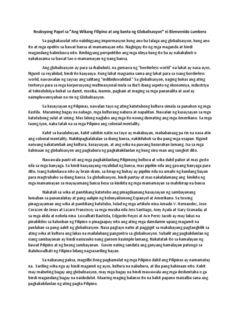 Reaksyon Wikang Pil At Banta Ng Globalisasyon