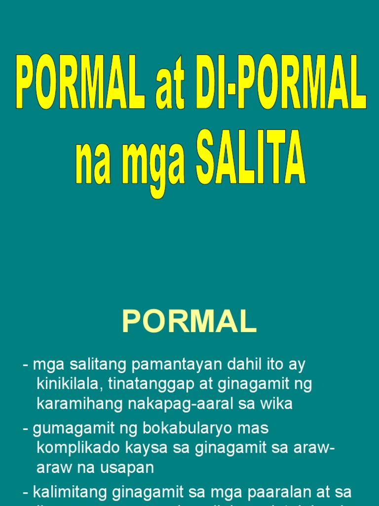 Ito ay walang halong opinyon ng manunulat. PORMAL ulli- mga salitang pamantayan dahil ito ay kinikilala tinatanggap at ginagamit ng karamihang nakapag-aaral sa wika. 862016 Pambansa - ito ay mga salitang ginagamit sa mga aklat na binabasa sa lahat ng mga mag aaral.